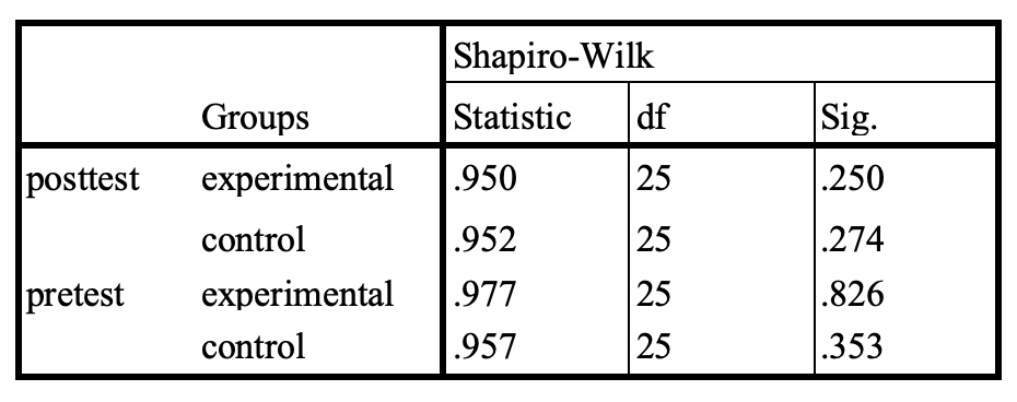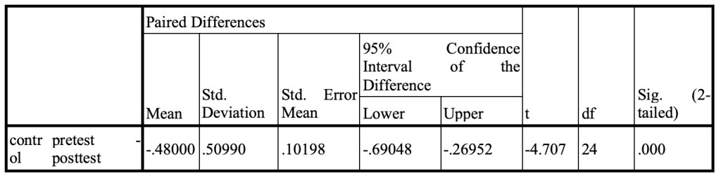 As could be observed in Table 7, at df = 24, the sig. is 0.000, and since the p<0.05, it could be concluded that the experimental group experienced statistically significant progress in self-directed learning from the pretest to the posttest.