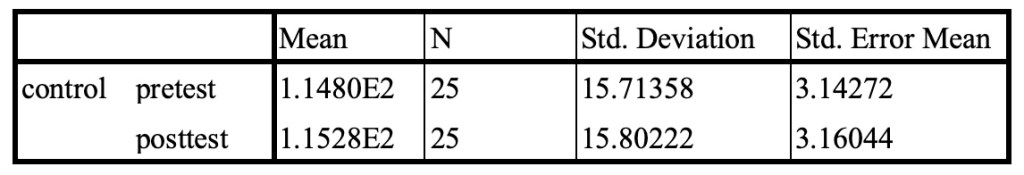 As shown in Table 4, the mean scores of participants in the control group are very close to each other in the pretest and posttest, 1.148 and 1.152, respectively. Although Table 5 shows that at df: 24, the sig is 0.000, which is lower than the P-value (p<0.05), which leads to this statement that there was progress from the pretest to the posttest, the mean scores comparison of the pretest and posttest showed that this progress was not highly remarkable. So, it could be concluded that this small progress resulted from in-class training within one month.