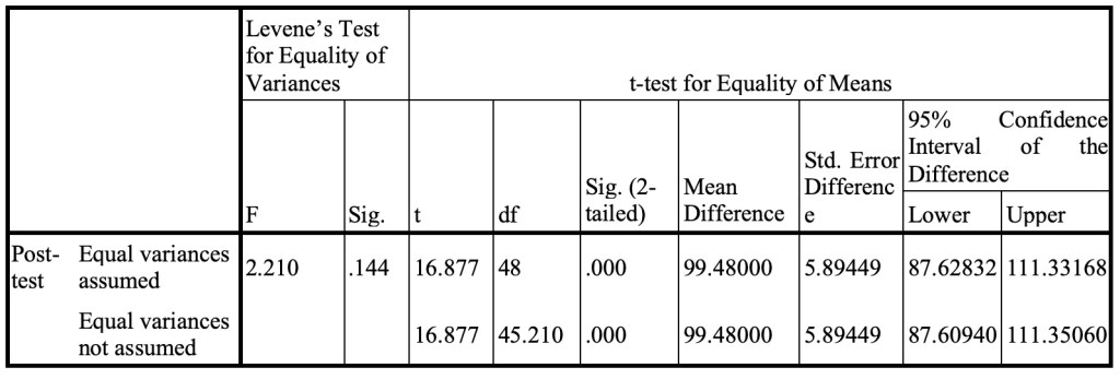 The results of Table 9 revealed that the variances may be unequal; the t-test results are highly significant, with a very big difference in means between the two groups: t = 16.877; df = 45.210; p-value < 0.001. The mean difference is 99.48, with a standard error difference of 5.89449. The 95% Confidence Interval, ranging from approximately 87.61 to 111.35, suggests that there is a large statistically significant difference in posttest scores between the groups when equal variances are not assumed.