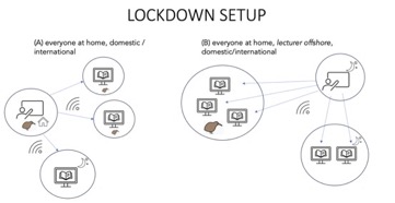 In the first phase, an emergency remote teaching approach was launched by the UoA immediately after the first lockdown was announced in March 2020. The university established this teaching delivery mode within one week after the announcement of the lockdown, and beforehand teaching staff were provided with the necessary software, hardware (for lecturers onshore), and training. The specifics on how to implement emergency remote online teaching in each course were left to the discretion of the lecturers. We could identify two designs (A and B) that we developed during the lockdown set-up (see figure 1). This setup was implemented during the first national lockdown in 2020 and the Auckland lockdown in 2021.
