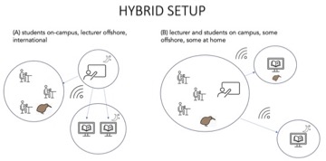 From a pedagogical point of view, the hybrid setup is the most demanding. We had to navigate tools for synchronous online teaching (e.g., web-conference software) to present the course content digitally. At the same time students on campus were gathering in an assigned classroom, and either used their own devices to participate in class and interact with the lecturer and students offshore, or they used the in-classroom computer to project the lecturer and the shared course content on the room’s screen. We had to take exceptional care when setting up group work as students’ geographical locations needed to be considered: students present on campus could work together, students online worked together in breakout rooms on Zoom.