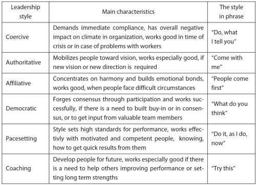 Six Leadership Styles (Goleman, 2000, pp. 82-83)