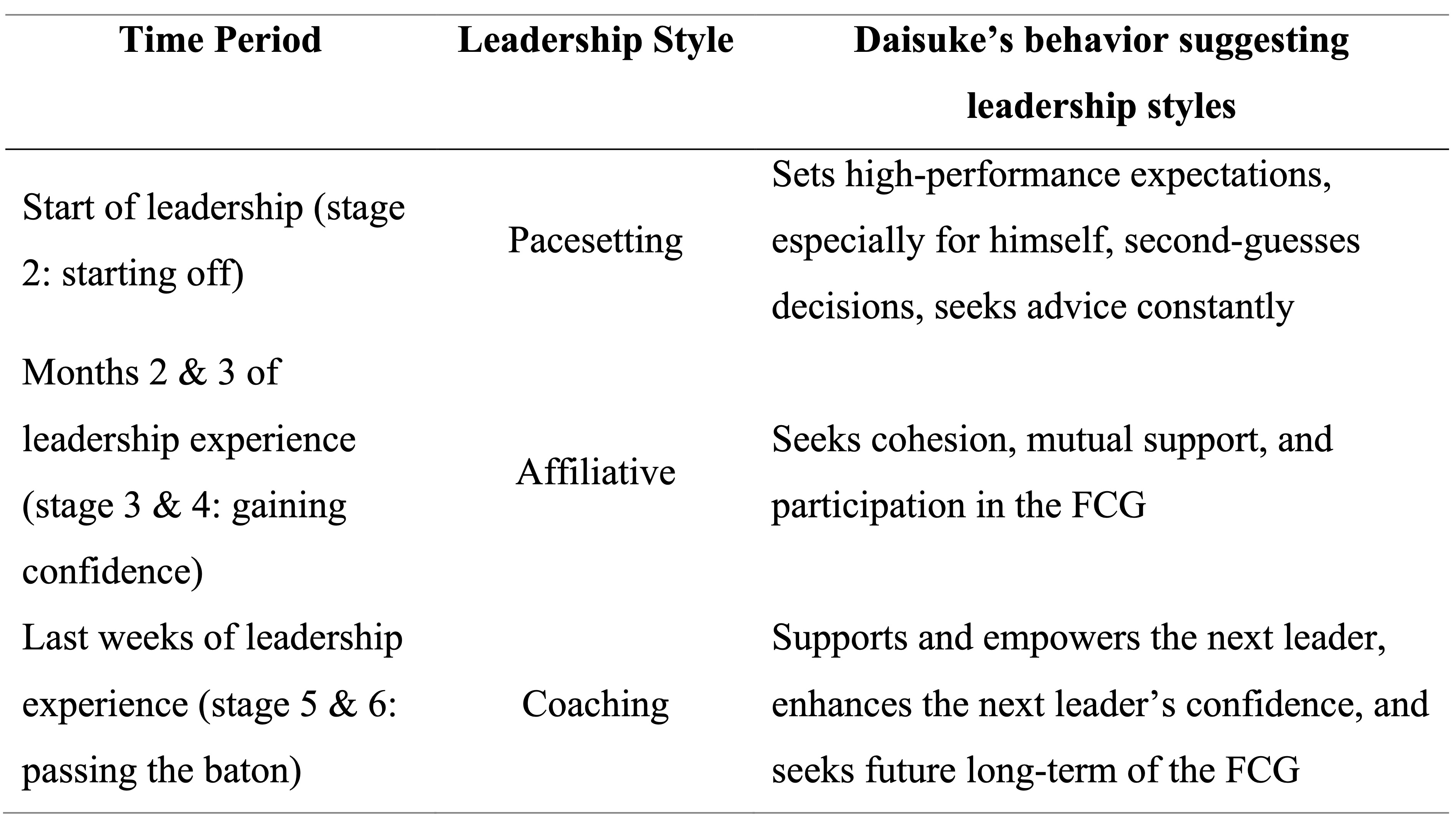 Furthermore, Daisuke’s comments indicate that his decisions were gradually less focused on his needs as a member of the community and more fostered on improving the members’ motivation, well-being and ownership. Mostly based on observations he made as a co-leader and leader during the FCG meetings and members’ comments and facilitated by the advising sessions and the weekly questionnaire. His initiatives included diversifying membership, restructuring speaking practice sessions, enhancing communication, and organizing cultural events, aligning with common community leader tasks outlined by Tarmizi et al. (2006, as cited in Watkins & Hooper, 2023). Furthermore, the roles undertaken, the tasks performed, as well as the decisions made indicate that Daisuke gained self-awareness and improved his ability to understand and interpret members’ needs based on their emotions and reactions during the FCG meetings. This suggests that his leadership style (based on Goleman’s descriptions, 2000 – See Table 1 for the description of each leadership style) has evolved progressively too, as shown in Table 3.