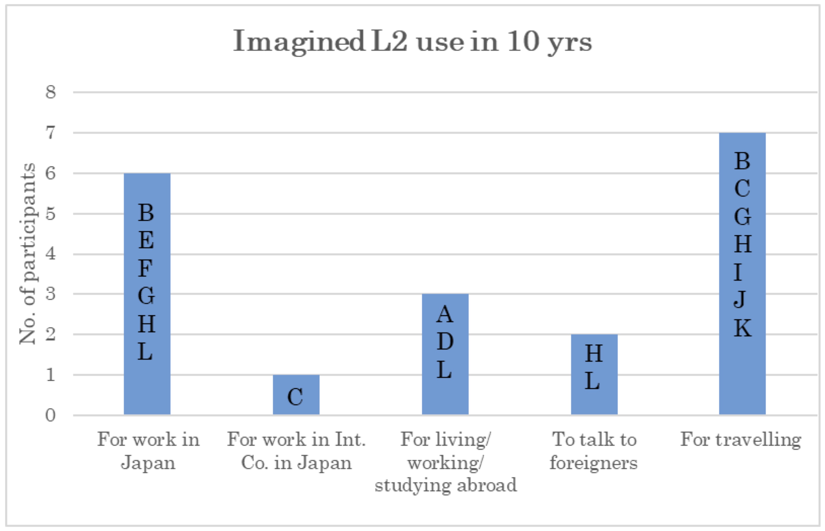 The theme of future English-speaking selves is related to how exactly, if at all, the participants in this study can imagine themselves using English in their futures. This theme is further divided into five sub-themes: 1. For Work in Japan, 2. For Work in an International Company in Japan, 3. For Living/Working/Studying Abroad, 4. For Talking to Foreigners, and 5. For Travelling Abroad. Figure 1 shows how each participant responded to questions relating to how they imagined themselves using the L2 (English) in 10 years.