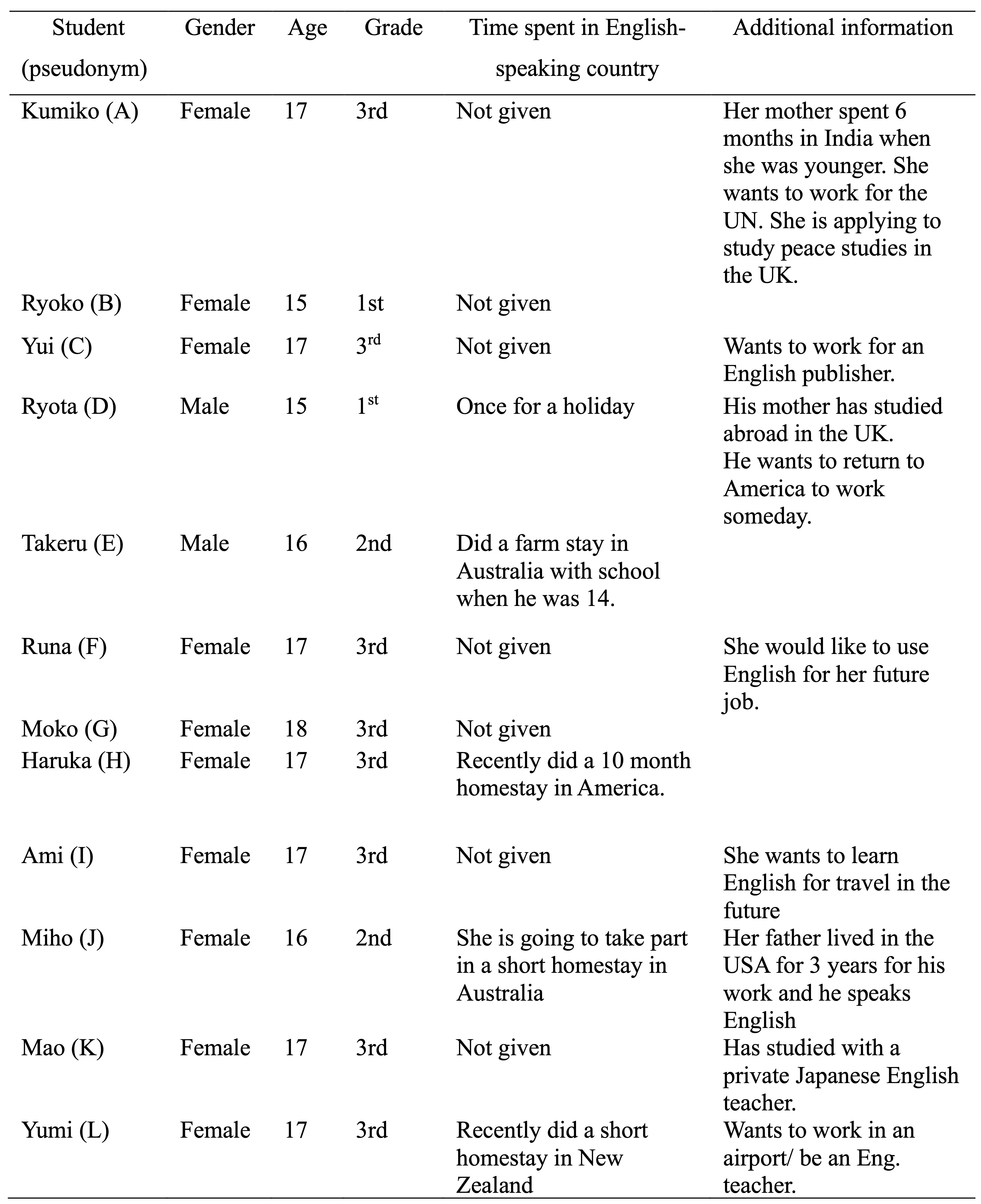 In total, 12 students took part in the study, referred to here as participants. They ranged in age from 15 to 18 at the time of the research, two were male and 10 were female, and all were Japanese high school students, taking six English classes per week, in the school in which the study took place. All 12 took part in an interview and completed a survey. As the sample size was not large, a focus on the qualitative aspect of the study enabled the researcher to probe for emerging data with each individual participant during the interview process. The school in which the research took place is a fee-paying high school where English is one of three core subjects studied, along with Japanese and math. In terms of academic achievement, the school is ranked about average and follows a curriculum that is in line with national Japanese guidelines. Table 1 gives an overview of the student profiles gathered as part of the study.