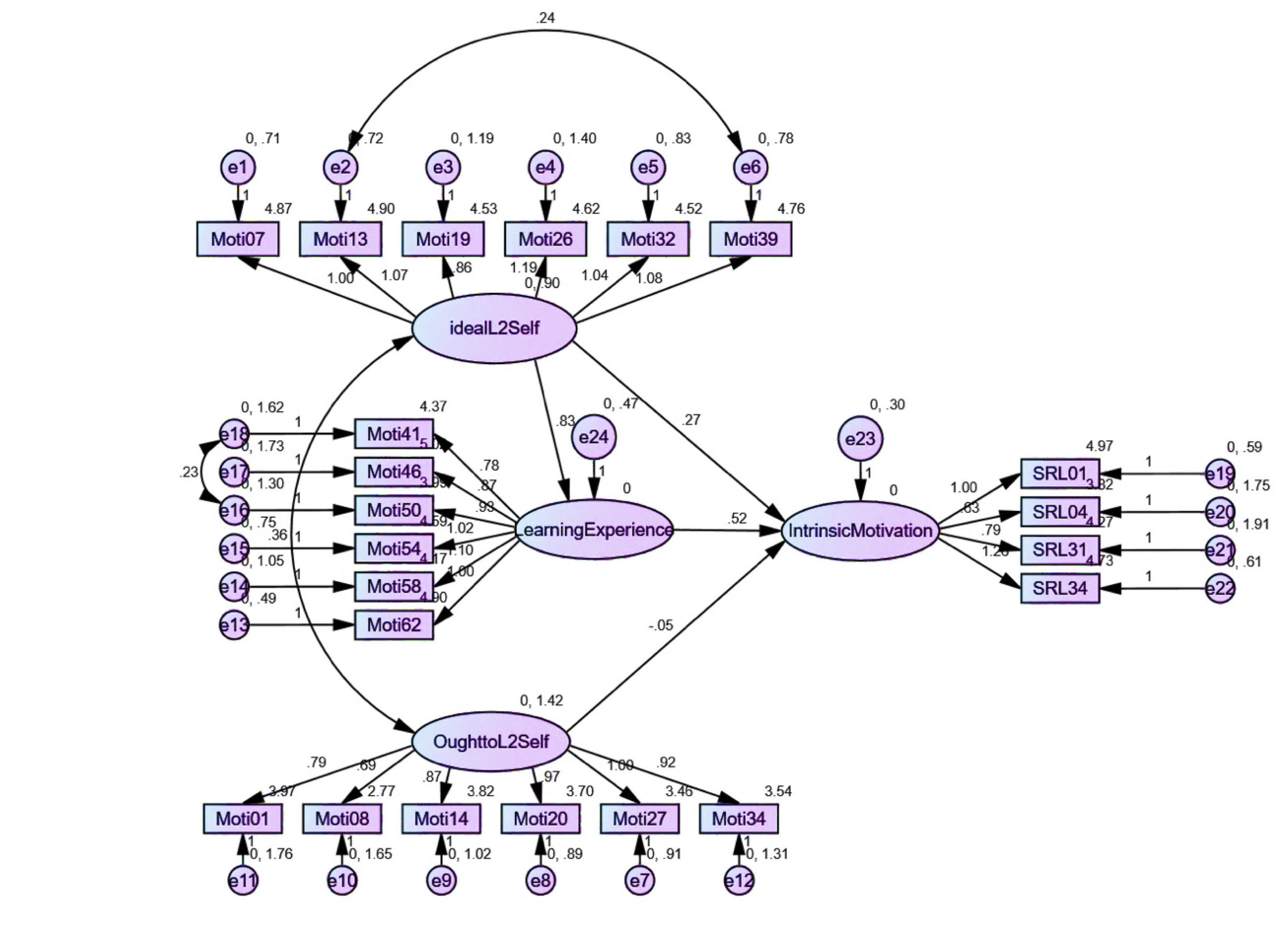 According to the figure, the motivational component of SRLL is the most robust causal relation between the English learning experience and IM. The figure displays a positive relationship between the ideal L2 self and IM. On the other hand, the effect of the ought-to L2 self on IM is negligible and statistically nonsignificant (p > .05). The results, therefore, show the robust effect of the English learning experience on the learner’s level of IM. The ideal L2 self can also contribute more to IM through the English learning experience (See Figure 2).