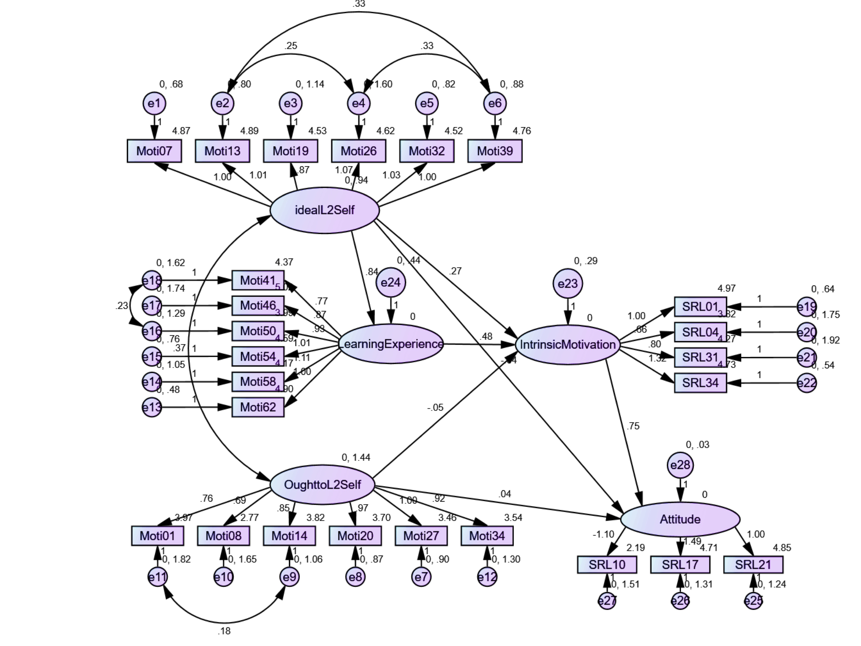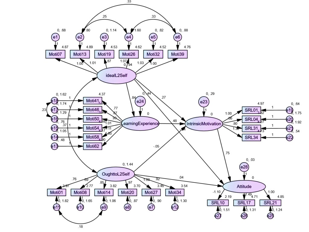 Learners’ attitudes to English learning were another component of SRLL investigated in the study. According to Figure 4, attitude, one of the components of SRLL, is strongly associated with IM and indirectly affected by the ideal L2 self. On the other hand, the values relating to other causal paths show that the effects of other components, including ought- to L2 self, are weak and nonsignificant (p>.05).