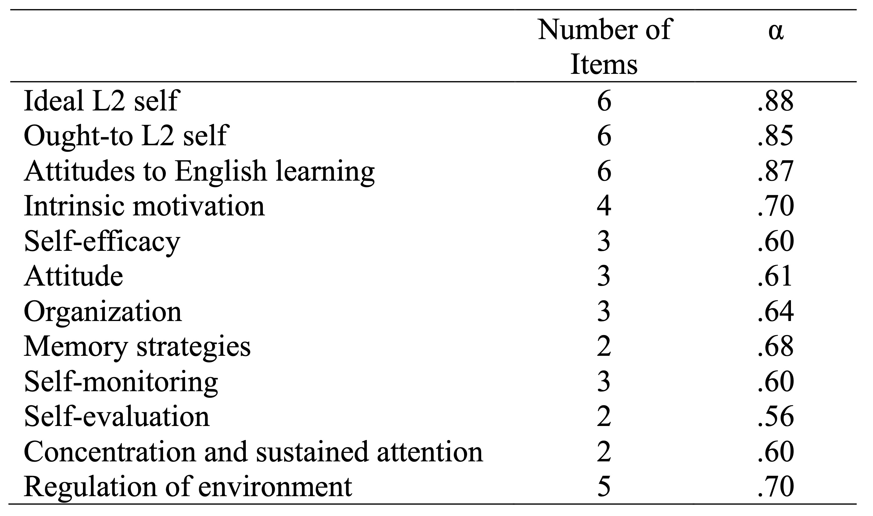 Components of L2 Motivational Self-System and SRLL With Cronbach Alpha Coefficients