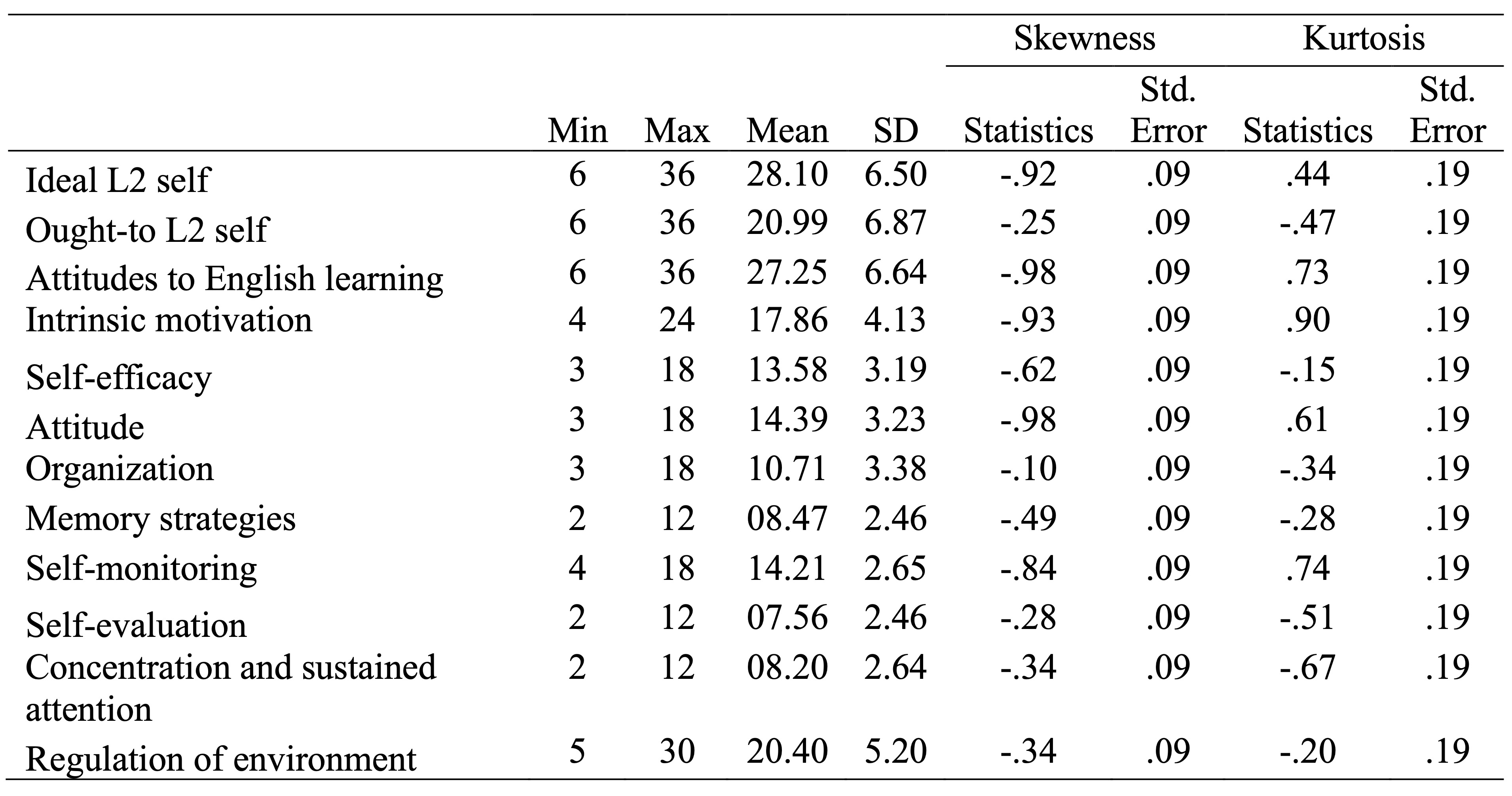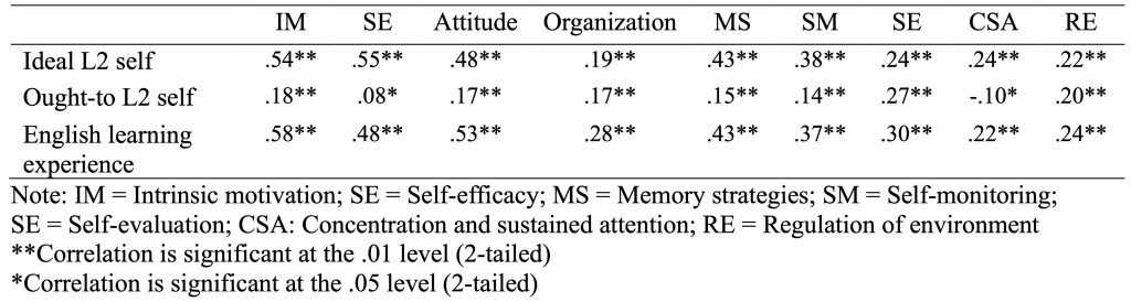 Table 3 displays the results of the Pearson Product-Moment correlation. As shown in the table, the strongest correlations can be found between the motivational and affective components of SRLL and two of the motivational variables: ideal L2 self and English learning experience. Ideal L2 self is significantly correlated with IM (r = .54, p = .002), self-efficacy (r = .55, p = .001), and attitude (r = .48, p = .001). The table also indicates significant positive correlations between English learning experience and IM (r = .58, p < .05), self-efficacy (r = .48, p < .05), and attitude (r = .53, p < .05). Moreover, the results indicate mostly weaker but statistically significant correlations between ideal L2 self and (meta)cognitive/behavioral dimensions: organization (r = .19, p < .05), memory strategies (r = .43, p < .05), self-monitoring (r = .38, p < .05), self-evaluation (r = .24, p < .05), concentration and sustained attention (r = .24, p < .05) and regulation of the environment (r = .22, p < .05). A similar pattern of correlations can also be found between English learning experience and (meta)cognitive variables: organization (r = .28, p < .05), memory strategies (r = .37, p < .05), self-monitoring (r = .37, p < .05), self-evaluation (r = .27, p < .05), concentration and sustained attention (r = .22, p < .05) and regulation of the environment (r = .24, p < .05). Additionally, the correlations between ought-to L2 self and components of SRLL are mostly weak though statistically significant (p < .01). Except for a weak negative correlation which exists between ought-to L2 self and concentration, other variables are positively correlated with this variable (See table 3).