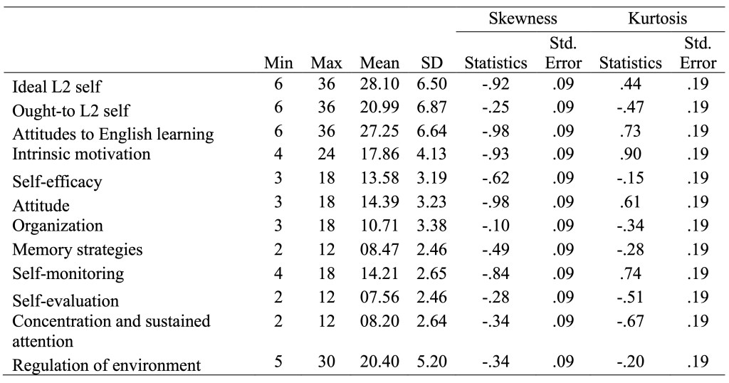 The skewness and Kurtosis of all the subscales fell within limits of ±2. Since these values have been approved as the acceptable range for normal distribution (e.g., Gravetter and Wallnau, 2014), it was concluded that the data were normally distributed.