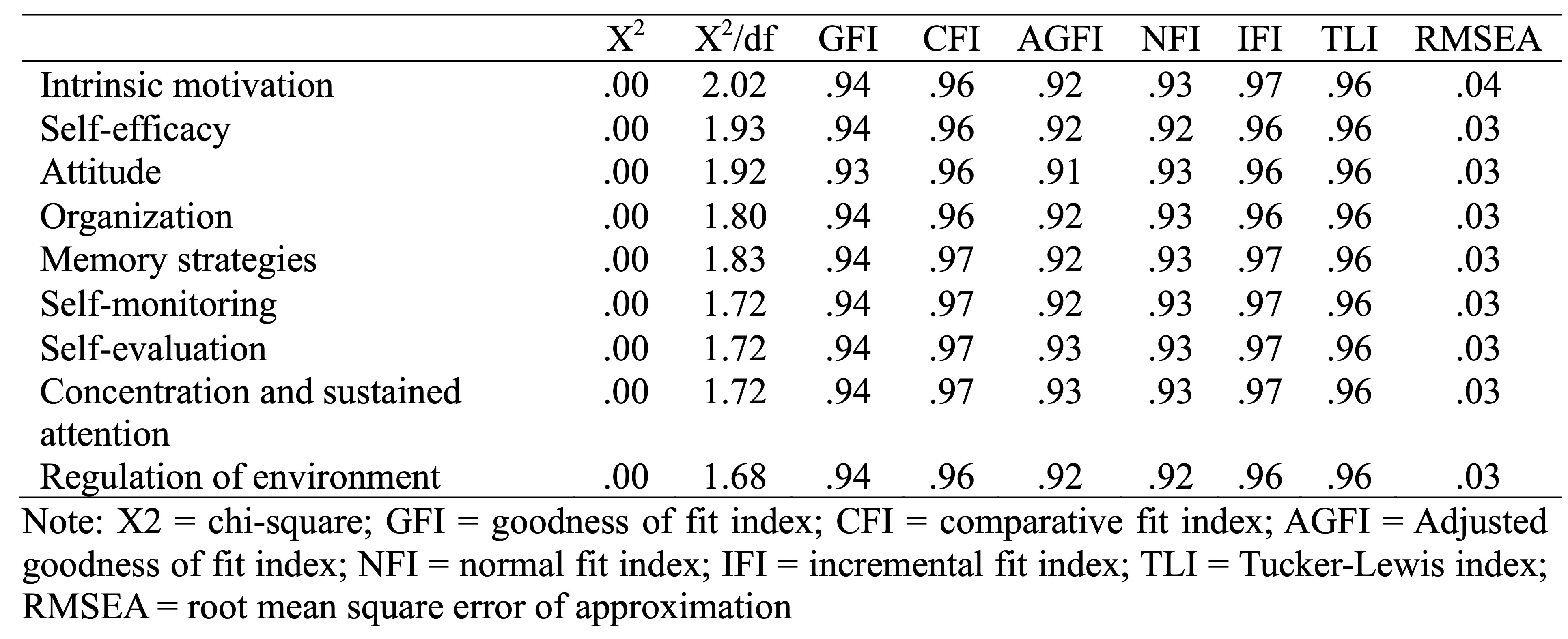 The appropriateness of the model was assessed using the indices commonly referred to in the previous studies (e.g., Taguchi et al., 2009; Tseng et al., 2006). Table 4 shows the extent to which the model is appropriate to describe the relationships between the L2MSS and different components of SRLL. The indices include chi-square statistics (X2), chi-square to degrees of freedom ratio (X2/df), goodness of fit index (GFI), comparative fit index (CFI), Adjusted goodness of fit index (AGFI), normal fit index (NFI), incremental fit index (IFI), Tucker-Lewis index (TLI) and root mean square error of approximation (RMSEA).
