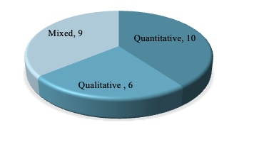 Regarding the research design of the included studies, Figure 2 presents their distribution as: quantitative research design was the most frequently used approach in these studies (10 out of 25). Mixed-methods research was also a popular choice (9 out of 25), combining quantitative and qualitative designs. Qualitative studies were less common (6 out of 25). Therefore, descriptive statistics were consistently used across quantitative studies. Thematic analysis was used for analyzing open-ended questionnaires, interview responses, classroom observations, participants’ reflective statements, and learning autobiographies. Descriptive statistics were used in conjunction with thematic analysis in mixed-methods studies.