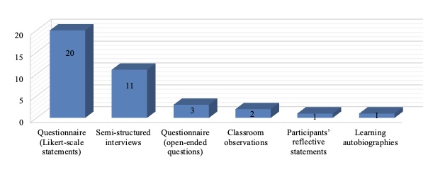 As for the instruments used, Figure 3 shows that the most popular instrument for gathering data was the questionnaire. It frequently consisted of Likert-scale (20), and occasionally open-ended questions (3). Semi-structured interviews (11) were commonly used to collect detailed viewpoints. Other instruments mentioned included classroom observations (2), participants’ reflective statements (1), learning autobiographies (1), and specific questionnaires like the Short List Questionnaire developed by Dixon (2011) was used by Alzubi et al. (2017).