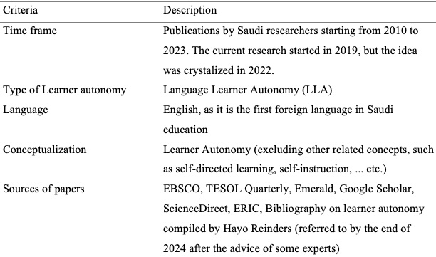Purposive sampling was used to identify 25 previous studies promoting LLA in Saudi Arabia for synthetic meta-analysis to code, analyze, and interpret their results. The researcher looked for papers published in journals and websites starting from 2010 to 2023; a period witnessed a shift in Saudi culture towards supporting learners generally and EFL learners specifically to be autonomous, adhering to a detailed set of steps to conduct research synthesis (Plonsky & Oswald, 2015). According to Amini Farsani and Babaii (2020), research synthesis is “the microscope” through which previous research is interpreted as well as “the telescope” through which future research could be directed.