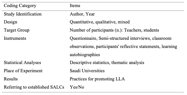 To obtain a picture of the Saudi researchers’ practices for promoting LLA, the researcher initially read the selected previous studies several times to create a coding scheme (Amini Farsani & Babaii, 2020; Plonsky & Gass, 2011; Plonsky & Oswald, 2015) which was developed and employed to extract information about each study following eight categories in terms of: (a) study identification, (b) methodological features (i.e., design, target group, instruments, place of experiment), (c) statistical analyses, (d) results indicating the current practices for promoting LLA, and (e) referring to an established SALC in a Saudi university.Table 2 clarifies this coding scheme as was applied to the synthesized body of research.